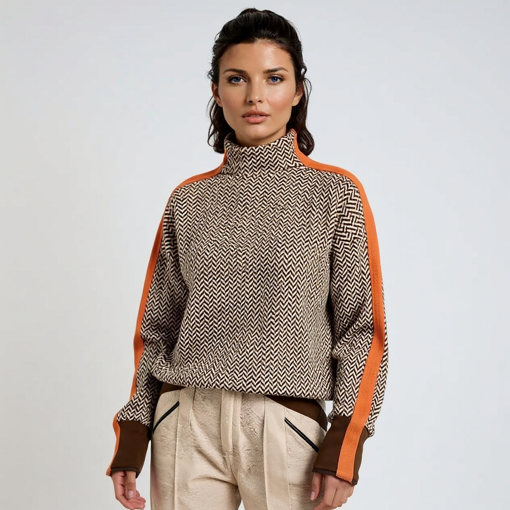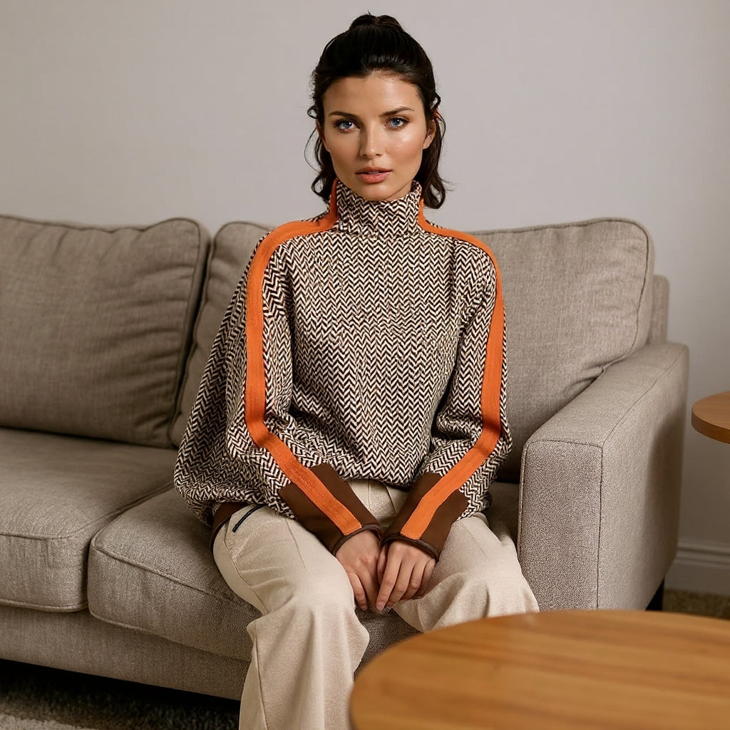 Malou to połączenie nowoczesnej elegancji i maksymalnej wygody. Kontrastowe paski nadają sylwetce wyrazistości, a wysoki kołnierz chroni przed chłodem i wygląda niezwykle szykownie. Miękka, przyjemna w dotyku tkanina sprawia, że sweter staje się Twoim ulubionym wyborem zarówno na co dzień, jak i na wieczorne chwile relaksu.